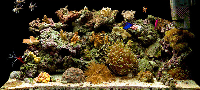 When shooting the entire tank, we shot at an angle to give the viewer a feel for how it looks in three dimensions. Although we went through pains to ensure the tank was properly exposed, the composition was meant to be viewed holistically. Therefore, we were not overly concerned with depicting the contents of the tank in the best possible manner.